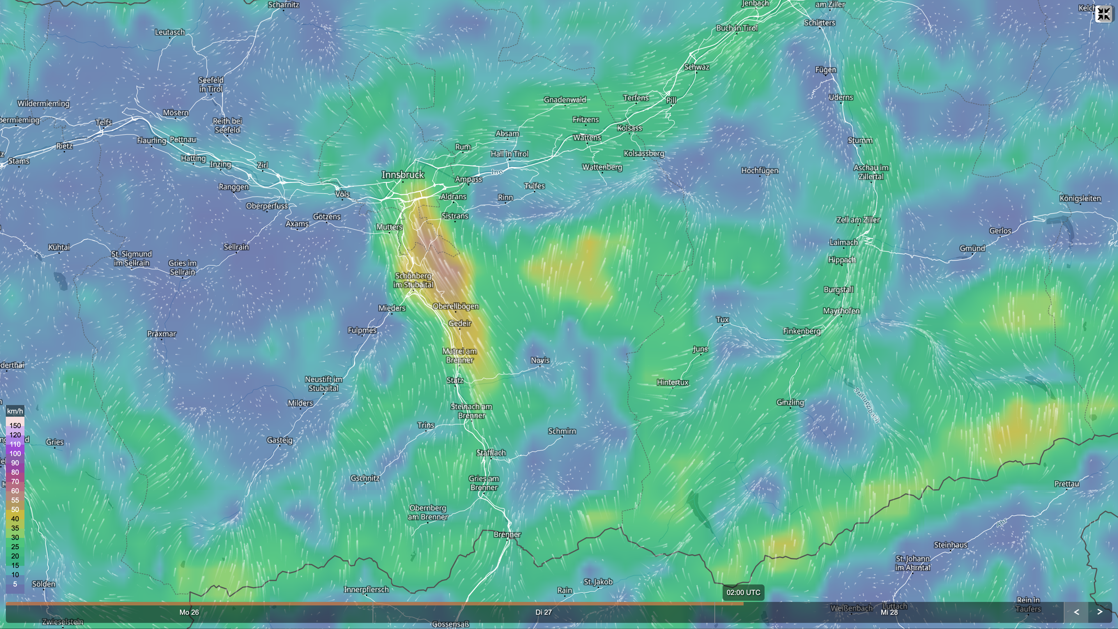 Ganz anders präsentiert sich die Lage nördlich des Alpenhauptkammes. Die Windkarte zeigt eine kräftige Südströmung, die sich ab Dienstag durch mehrere Alpentäler kanalisiert.