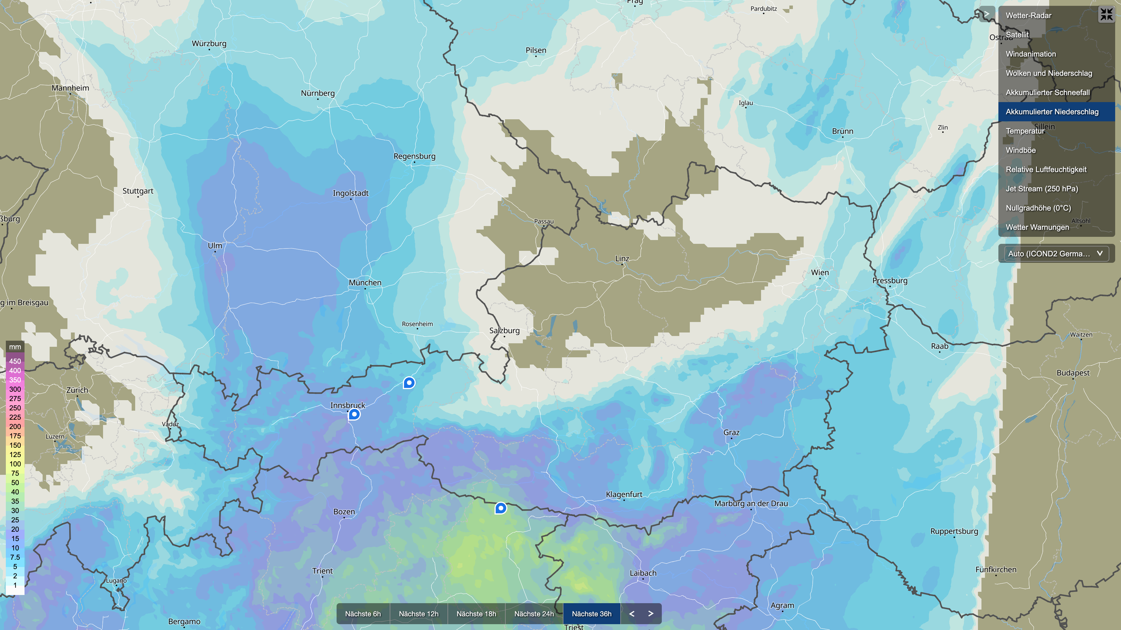 Der Schwerpunkt der Niederschläge liegt klar im Alpenraum. Besonders begünstigt sind: