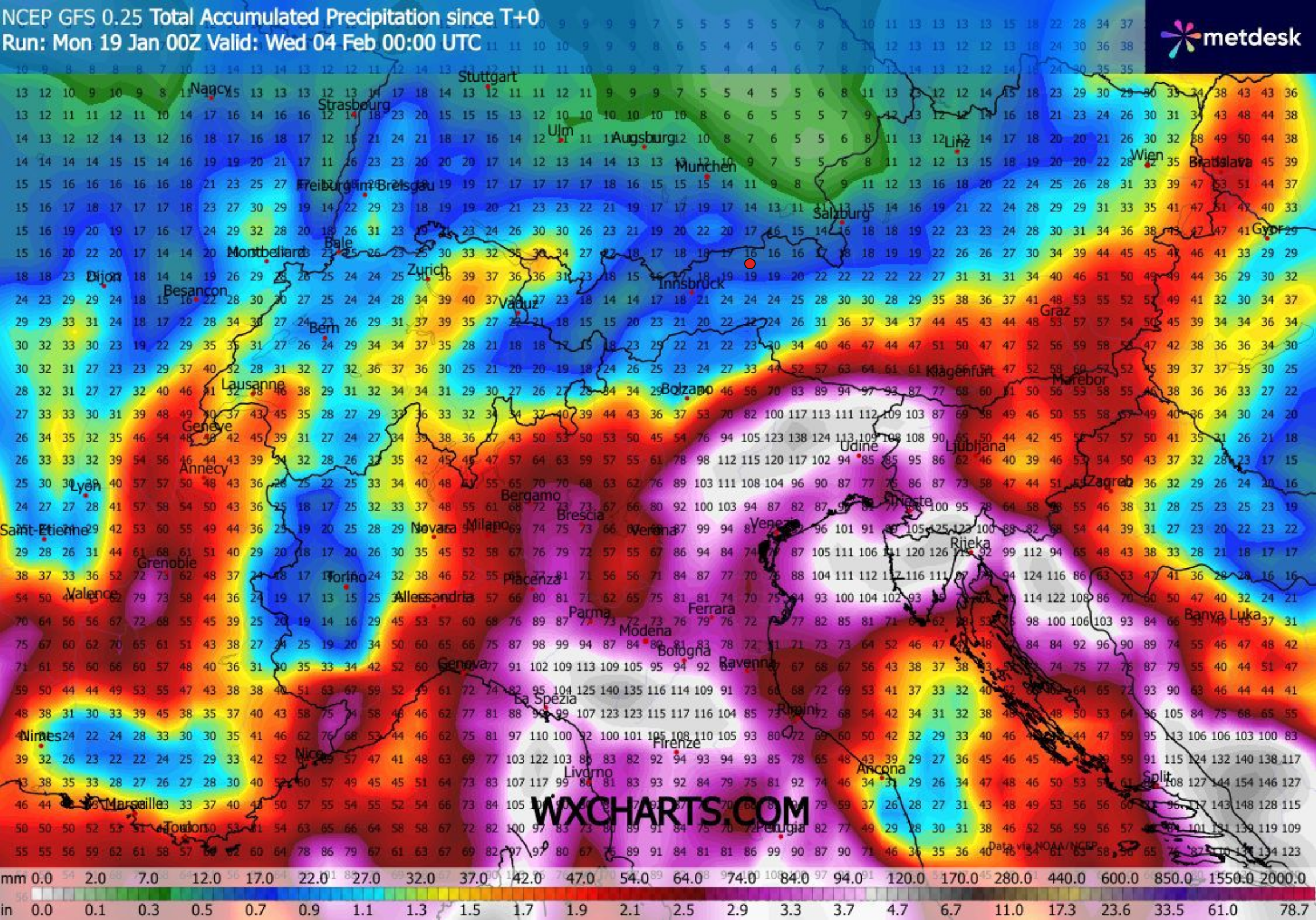 Klassische Zweiteilung: Die Alpensüdseite ist deutlich nasser, die Nordseite zurückhaltender. Auch hier bleibt die Option auf eine winterlichere Phase Richtung Februar bestehen.