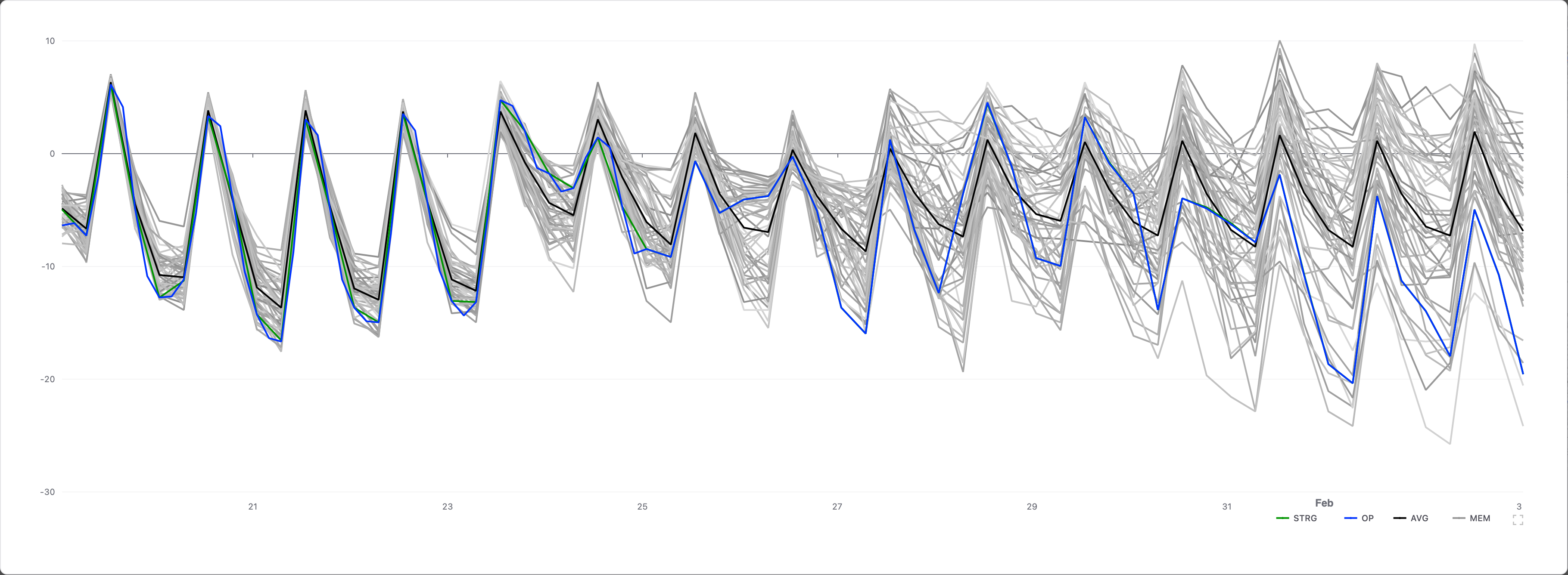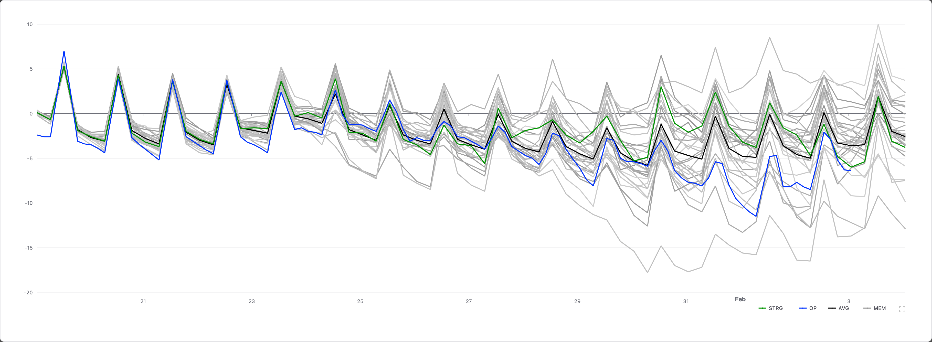Bis etwa 25. Januar verlaufen die Temperaturen noch relativ geordnet. Danach zeigen die Modelle eine zunehmende Spreizung: